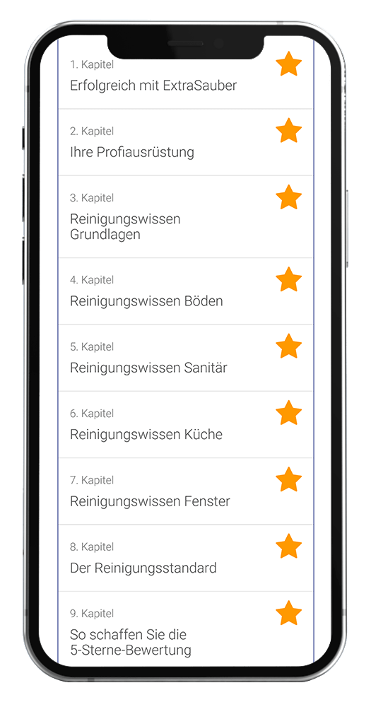 Du willst auf ExtraSauber erfolgreich werden? Noch öfter gebucht werden? Und noch mehr Geld verdienen? Als ExtraSauber Partner erhältst du von uns wertvolle Tipps und Reinigungswissen, um deine Kunden von deiner Leistung zu überzeugen. Selbst schon Profi? Dann schule mit der ExtraSauber Academy im Handumdrehen dein Personal.